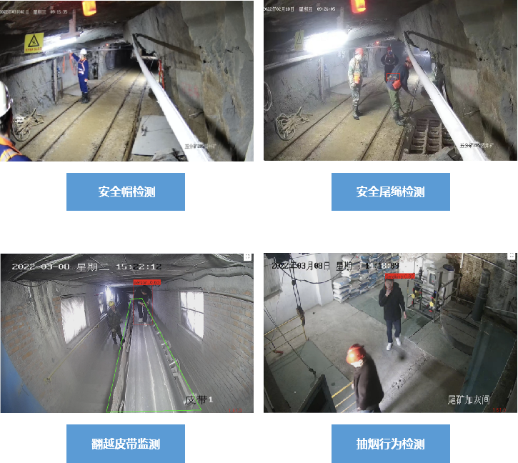 生产车间安全监测行为涉及跨越皮带、作业未戴防护面罩、未系安全绳、吸烟、玩手机、未戴安全帽等;执法记录仪监测主要为井下采掘作业面的安全作业细节,涉及不戴安全帽、吸烟等行为。
